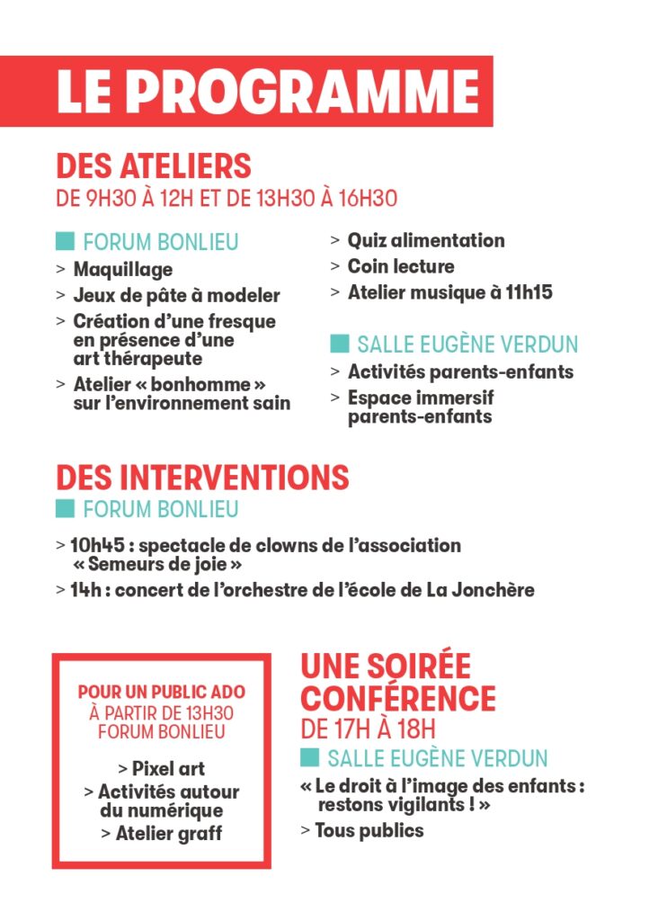 Enfance 74 sera présente toute la journée et proposera des jeux autour du droit à être nourri et de celui à être soigné, ainsi qu une activité maquillage